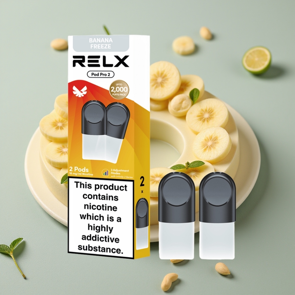 RELX Pod Pro 2 600 Puffs 1.8% Nikotin 1.9ml Dessert-Banane Eis Verpackungsoptionen 2/3 Pods 3 Spannungsstufen